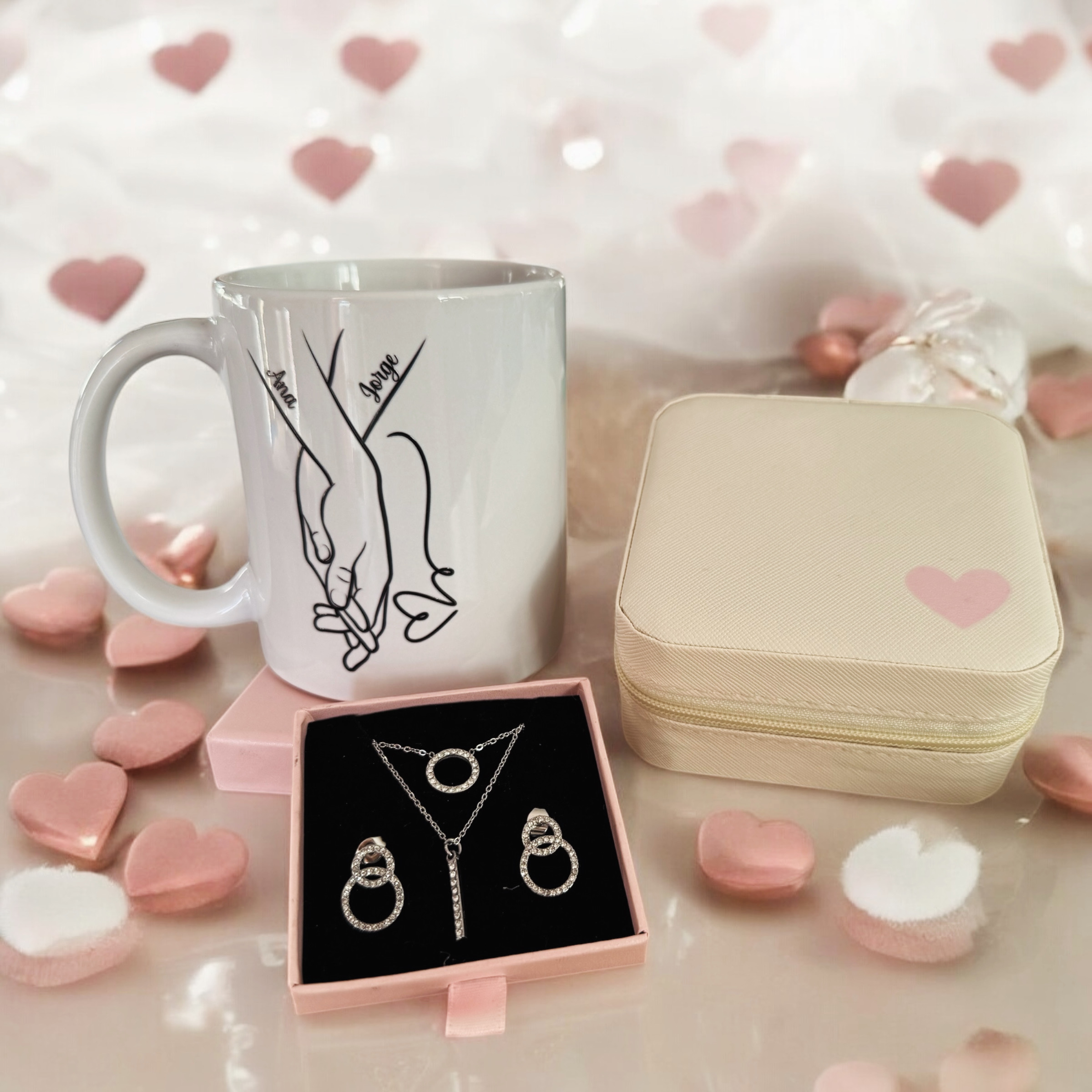 💝 Pack San Valentín: Taza + Joyero + Joyas + Dulces 🎁