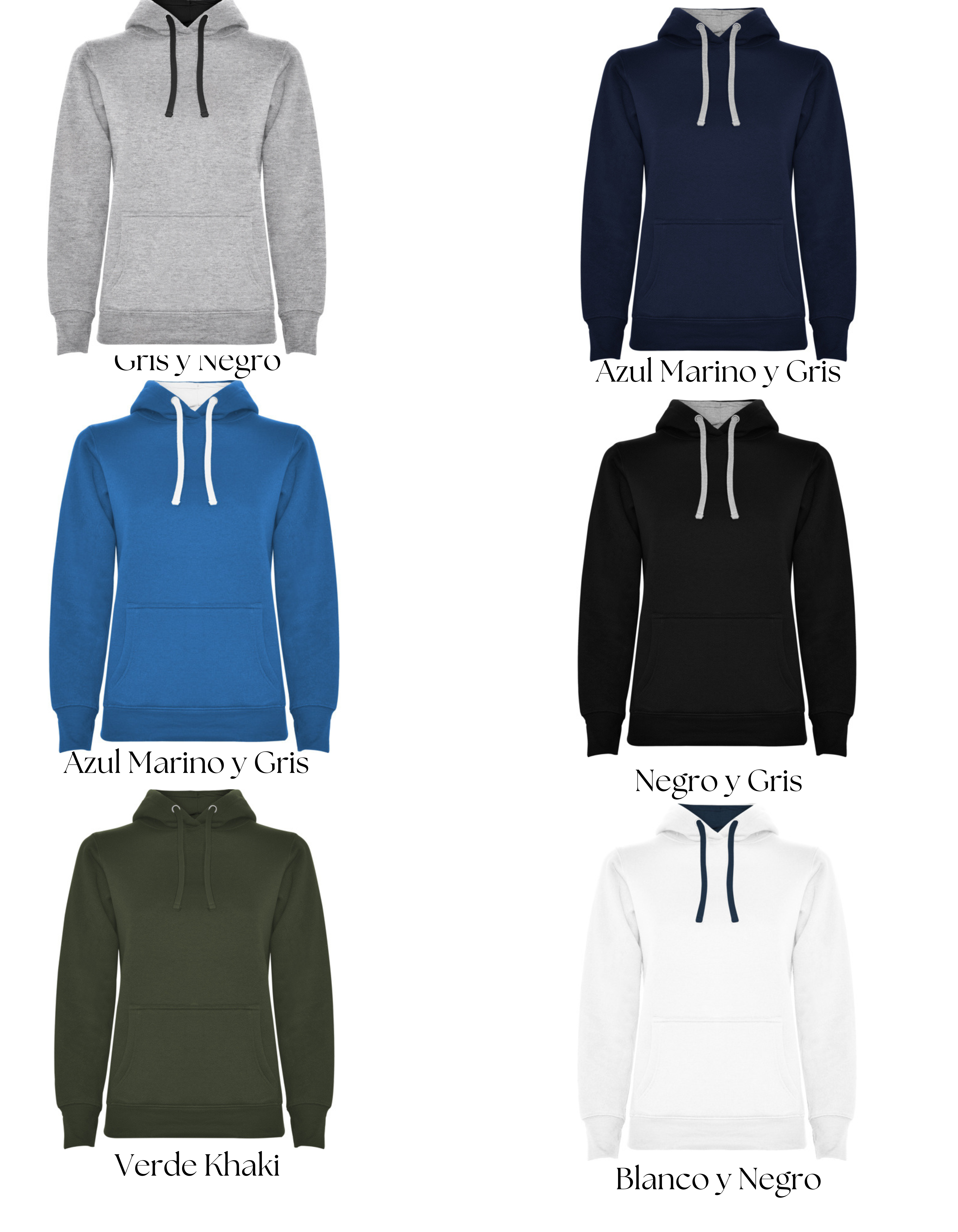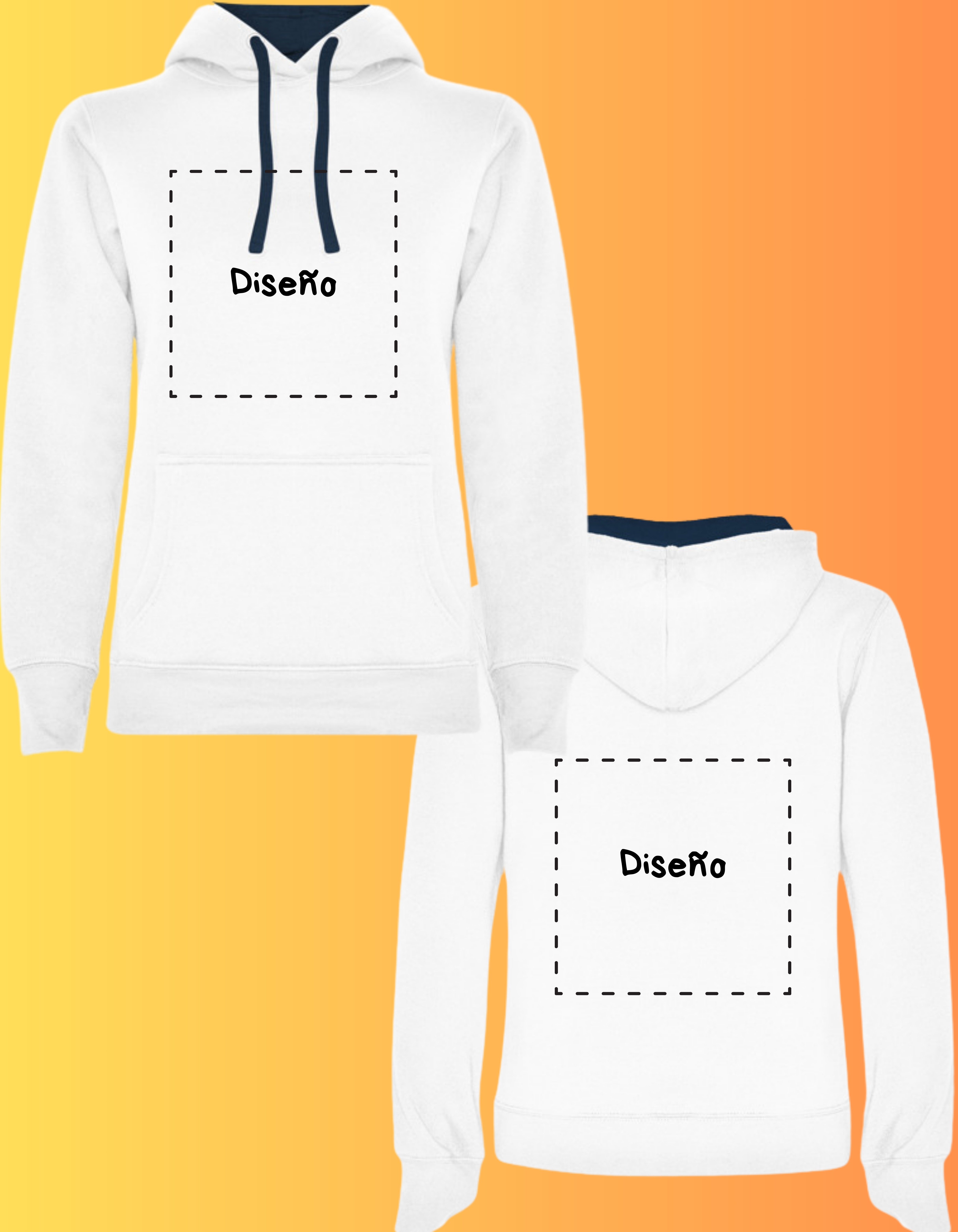 Sudadera entallada de corte femenino con capucha bicolor de doble tejido, con cordón contrastado ajustable,